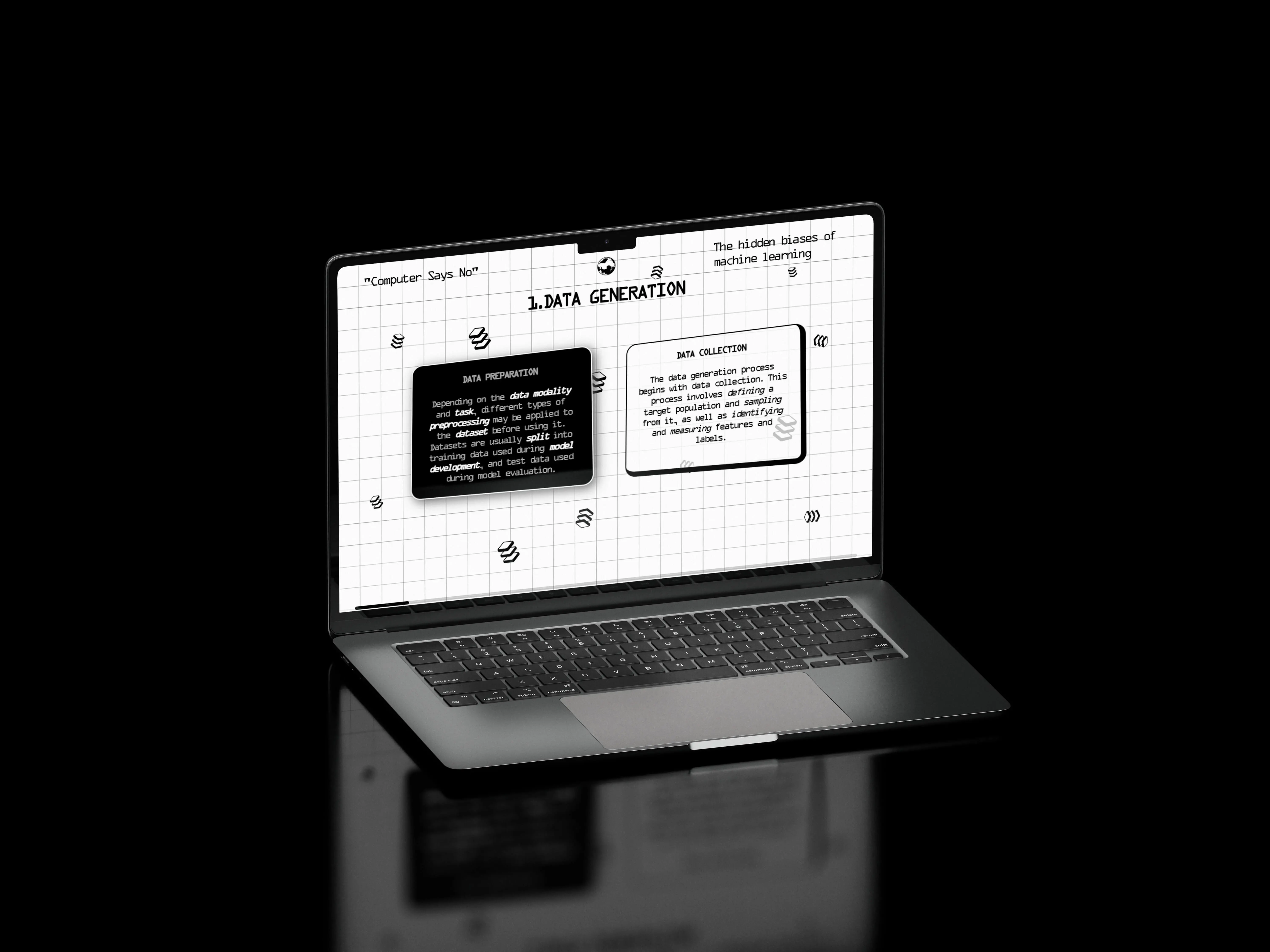 The project “Computer says no” takes as its title an expression that satirizes this opacity, seeking to reveal the hidden biases of machine learning. Developed as an evolving, diagrammatic narrative, presented on a website, the project breaks down how human, social, and cultural biases are embedded in training datasets and amplified in the machine learning process.