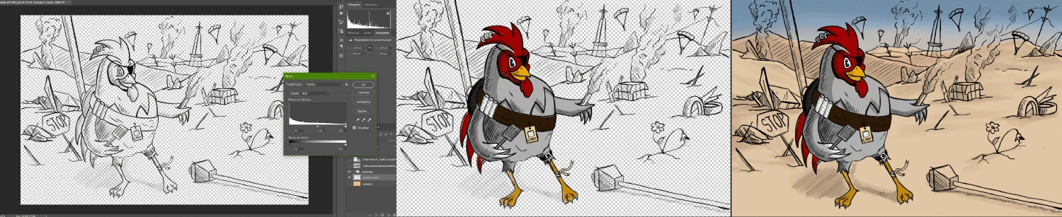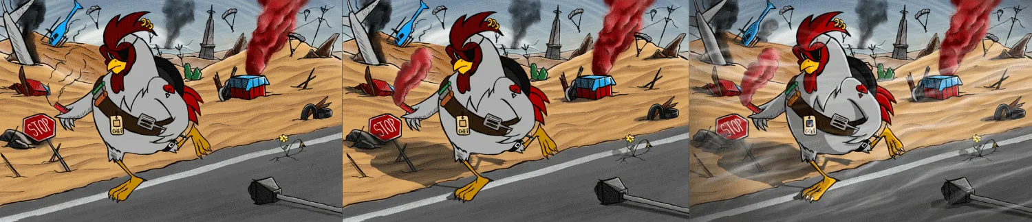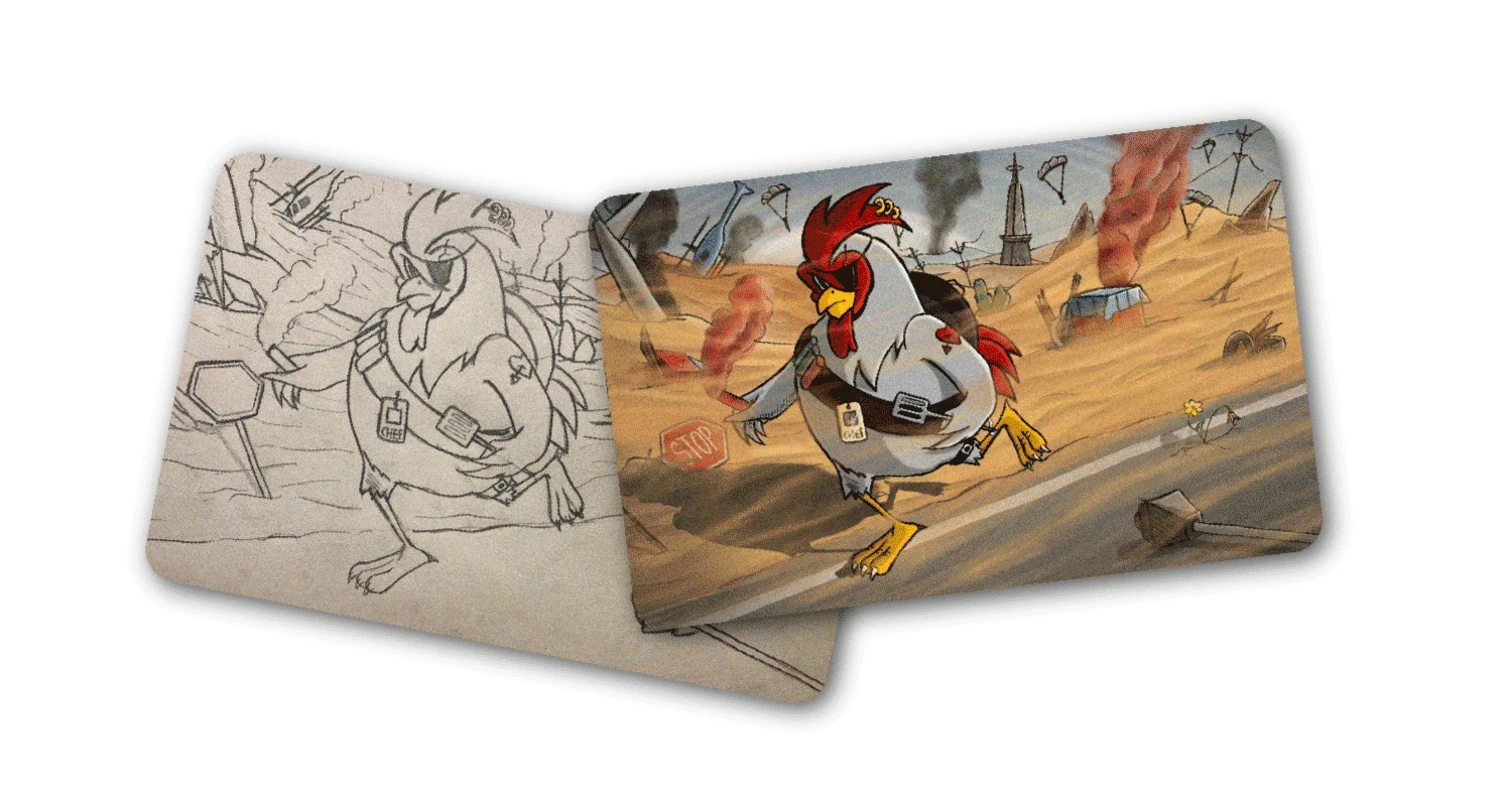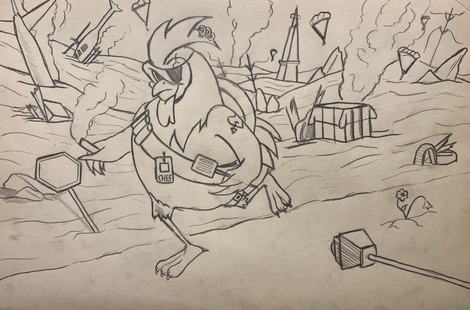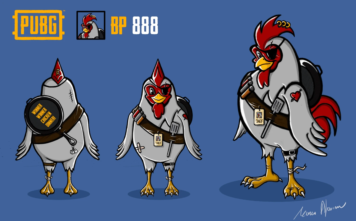consists of a splash art style illustration where the concept aims to portray an environment of war and survival from the video game “PUBG”, with the main focus being the original Fan art of the mascot trying to survive what is happening.