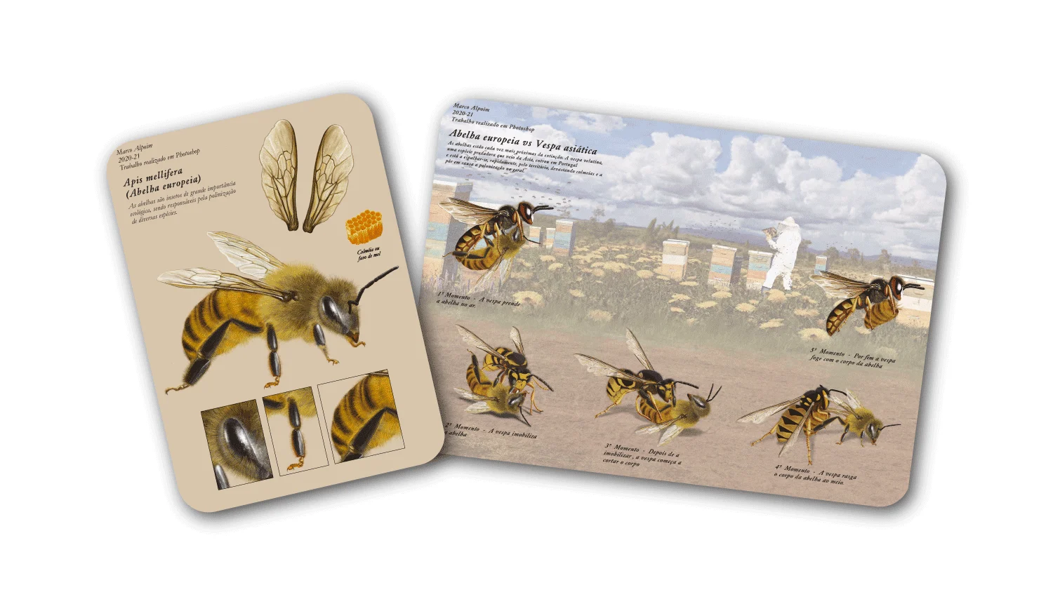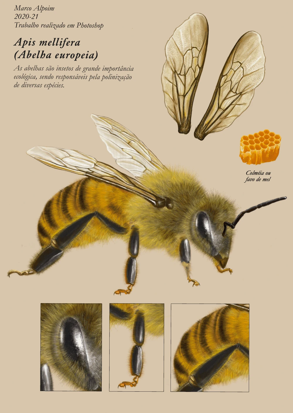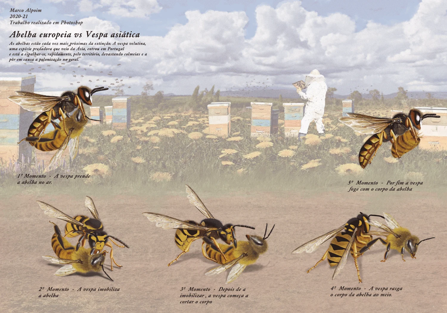 A realistic digital illustration of the European honeybee, also known as apis mellifera, this illustration depicts not only the details and characteristics of the bee, but also one of the biggest problems they face today, the extinction caused by the Asian hornet, a predatory species that came from Asia, entered Portugal and is spreading rapidly throughout the country, devastating hives and jeopardizing pollination in general.